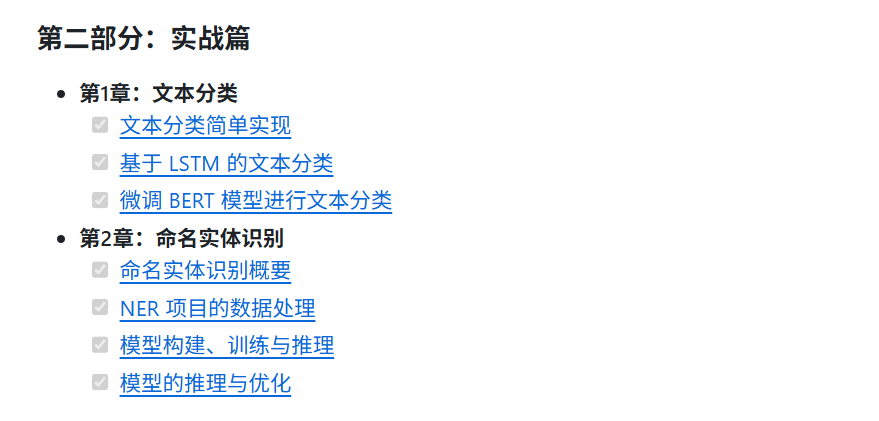 学完上面的理论知识,就可以找一些案例来进行实战,在实战中看看不同模型的效果。首先是文本分类任务,文本分类像朴素贝叶斯这种简单的机器学习算法就能实现,后续发展是用LSTM等模型来做的,现在是用BERT等大模型来做,对比一下不同算法模型的区别