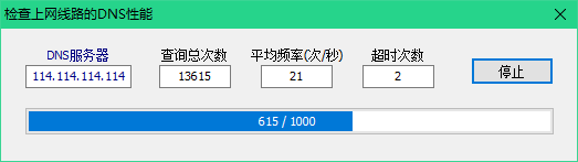 说明:近期发现某个电信运营商上网宽带的DNS服务的一个问题:DNS查询频率有限制, 而且使用其他DNS服务器不解决问题。如果这种宽带只是在家庭里面使用,DNS的查询频度还没达到上限,但如果是在单位里面使用,当使用人数较多时,DNS查询频率会大于限制的频率,造成上网卡顿的问题。在遇到上网卡顿,但Ping又正常时,可以用此程序检查上网线路的DNS性能。需用运营商提供的DNS服务器的ip地址替换上图中的DNS服务器ip地址。让查询次数达到1万次以上,看看有没有超时的现象。如果超时较多,就应该联系运营商解决了。