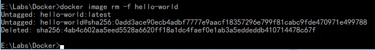如果不需要这个镜像了,可以使用docker image rm -f hello-world删除: