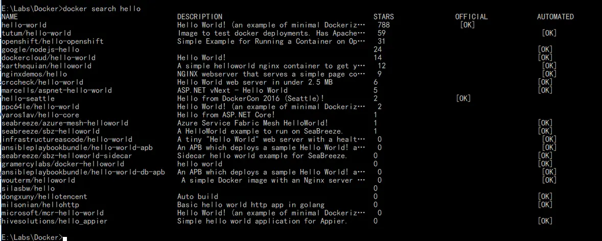我们首先拉取一个helloworld看看能不能玩。先用docker search看一下有没有: