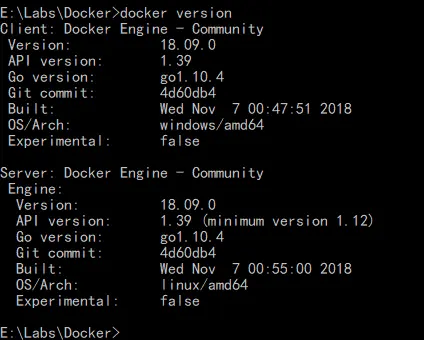我们现在命令行下运行docker version看看: