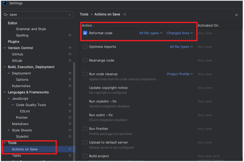 4.如果只想对修改的部分使用这个format,那就去Setting-> Actions on Save-> Reformat code->Changed lines 里面设置一下