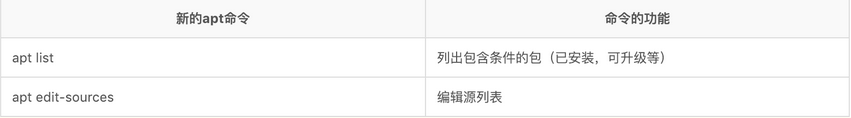 apt 命令的引入是为了解决命令过于分散的问题,它包括了 apt-get 命令出现以来使用最广泛的功能选项,以及 apt-cache 和 apt-config 命令中很少用到的功能。