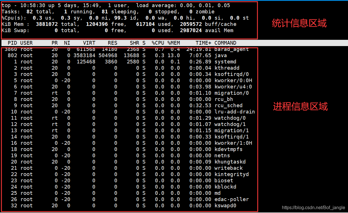top命令输出分两个区域:上部分为信息统计区域、下部分为进程信息区域。