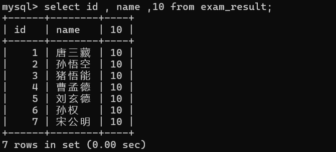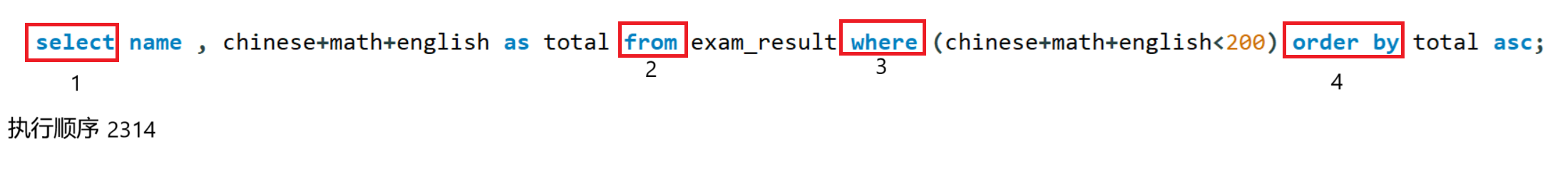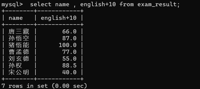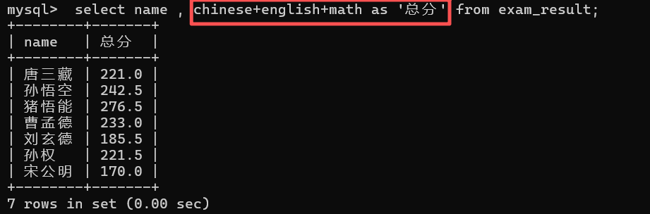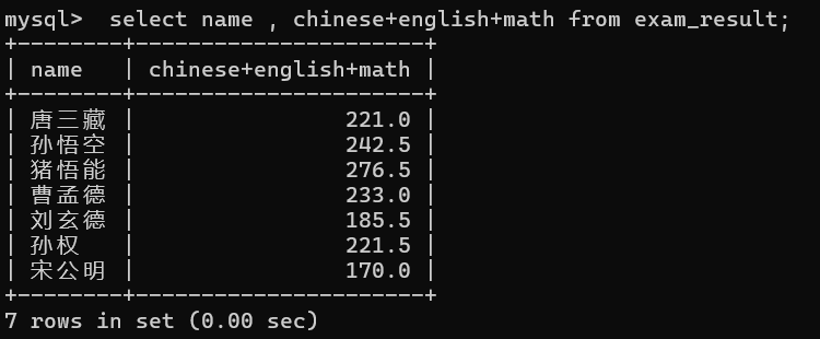 示例 : select name , chinese+english+math as '总分' from exam_result;