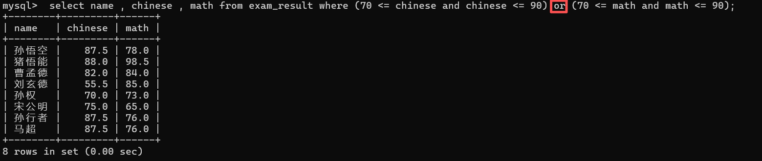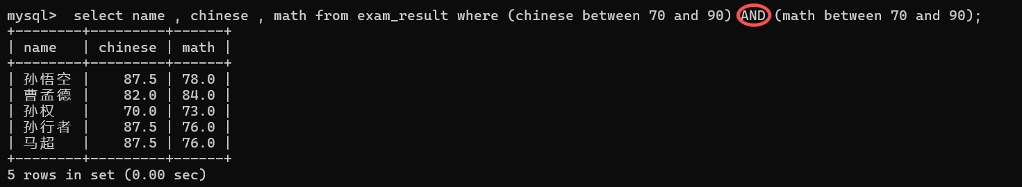 MYSQL 中不允许使用 70 <= chinese <= 80 |