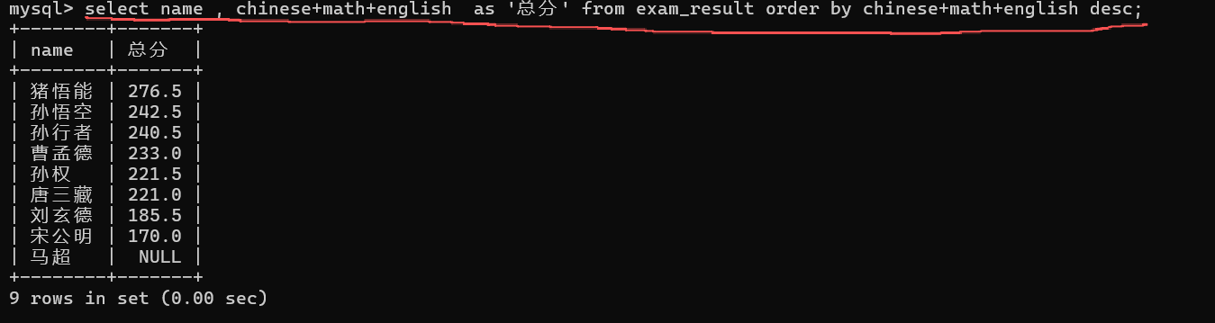 示例 1 : select name , chinese+math+english as '总分' from exam_result order by chinese+math+english desc;