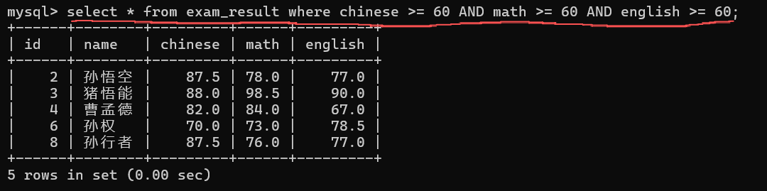 select * from exam_result where chinese >= 60 AND math >= 60 AND english >= 60;