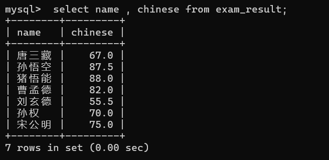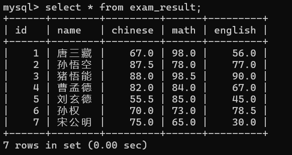 insert exam_result values(8,'孙行者', 87.5, 76, 77);