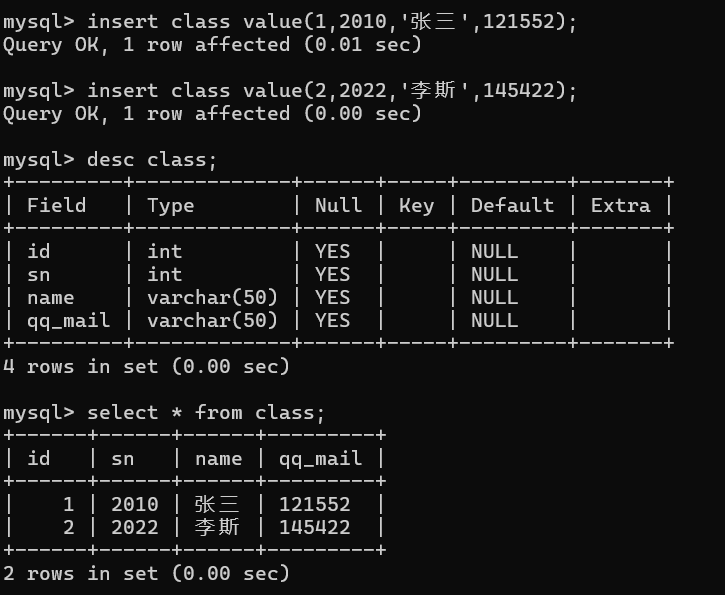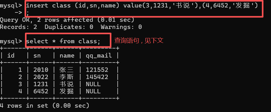 示例 : insert class (id,sn,name) value(3,1231,'书说'),(4,6452,'发掘');