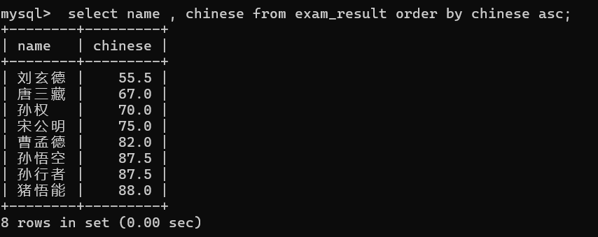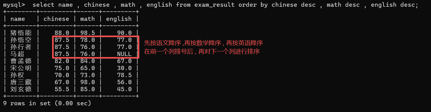 示例 : select name , chinese , math , english from exam_result order by chinese desc , math desc , english desc;