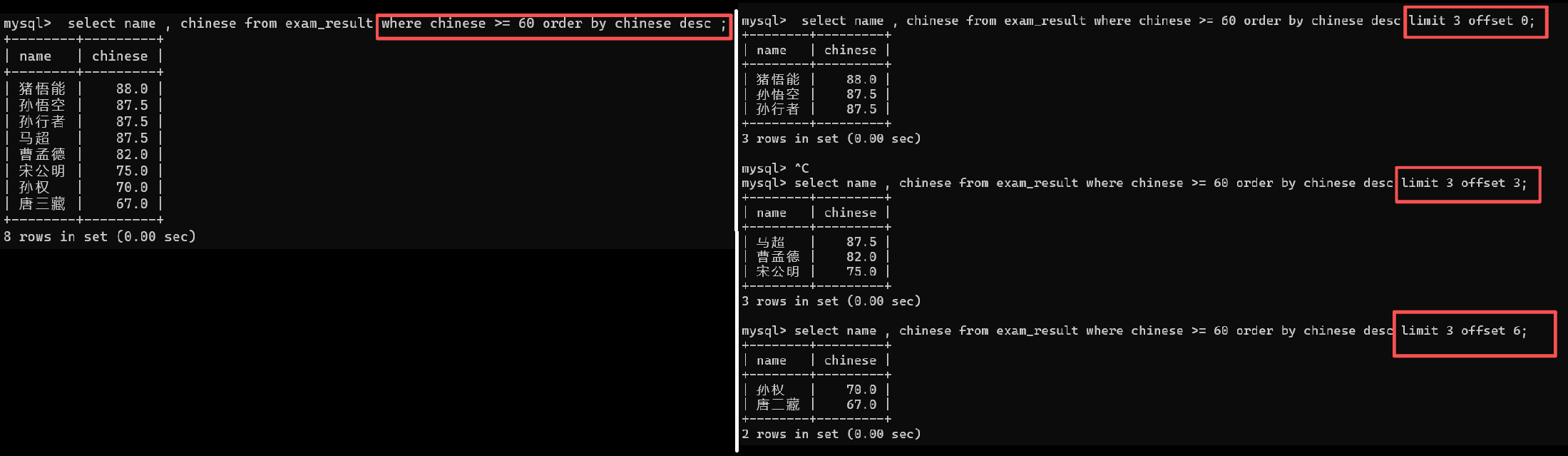 从 s 开始,筛选 n 条结果 : SELECT ... FROMtable_name [WHERE ...] [ORDERBY ...] LIMIT n OFFSET s;