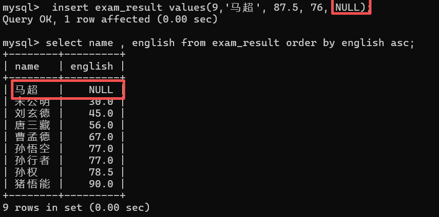 insert exam_result values(9,'马超', 87.5, 76, NULL);