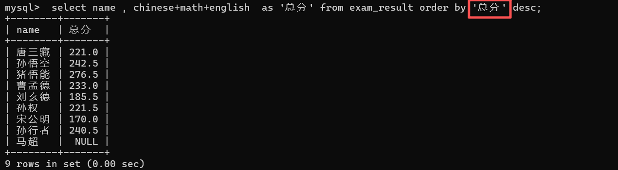 示例 2 : select name , chinese+math+english as '总分' from exam_result order by '总分' desc;