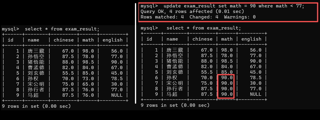 update exam_result set math = 90 where math < 77; (如果数学成绩小于 77 , 则将数学成绩改为 90)