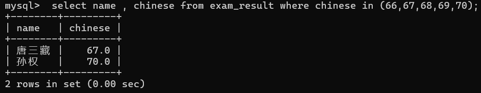 select name , chinese from exam_result where chinese in (66,67,68,69,70);
