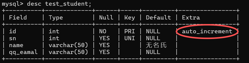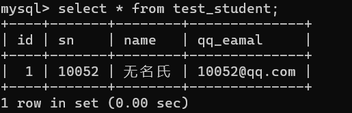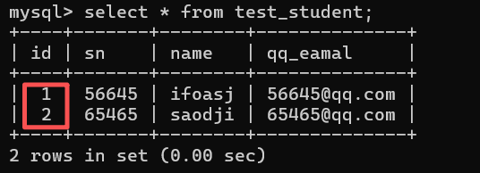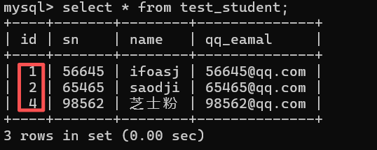 insert into test_student (sn,name,qq_eamal) values(98562,'芝士粉','98562@qq.com');#未插入 id