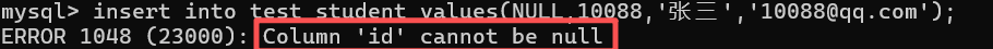 - 如果 : insert into test_student values(NULL,10088,'张三','10088@qq.com'); 插入了 NULL则会报错 :