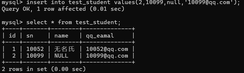 insert into test_student values(1,56645,'ifoasj','56645@qq.com'),(null,65465,'saodji','65465@qq.com');#插入的 id 为 NULL