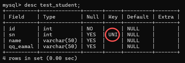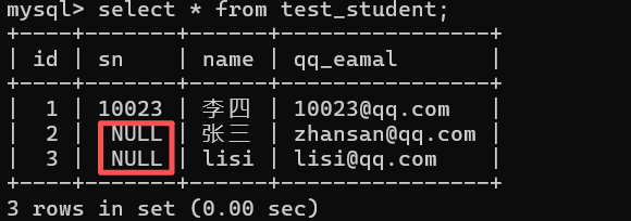 - 第二次插入相同的值是 NULL时 , 不会报错 : insert into test_student values (1,10023,'李四','10023@qq.com'), (2,null,'张三','zhansan@qq.com'), (3,null,'lisi','lisi@qq.com'); select * from test_student; #显示表内容