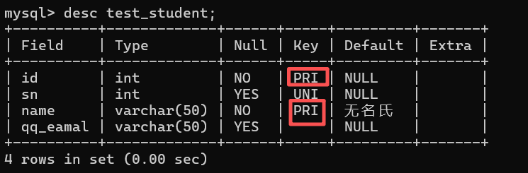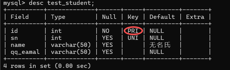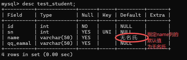 - 指定插入数据时 , 如果被 DEFAULT 约束的列为 NULL , 则会使用默认值 : insert into test_student (id,sn,qq_eamal) values(1,10052,'10052@qq.com');#没有插入 name 列