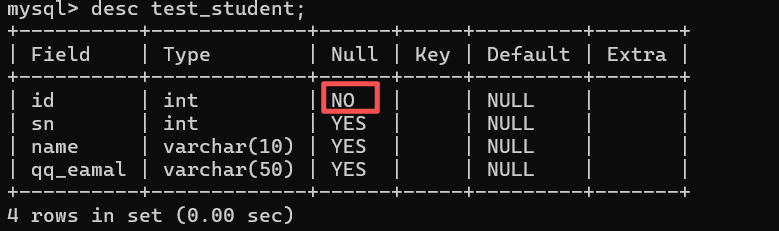 - 只有非空列有值时才能正常写入 例如 : insert into test_student values(1,10023,'李四','10023@qq.com');