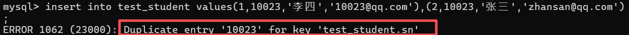 - 第二次插入相同的值就会报错 : insert into test_student values(1,10023,'李四','10023@qq.com'),(2,10023,'张三','zhansan@qq.com');