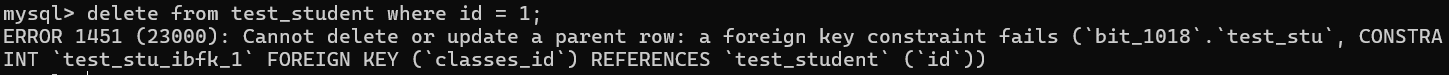 - 删除主表中的数据时 , 如果子表中存在对主表的依赖时 , 如果直接删除主表中的信息会报一个主外键关系的错误