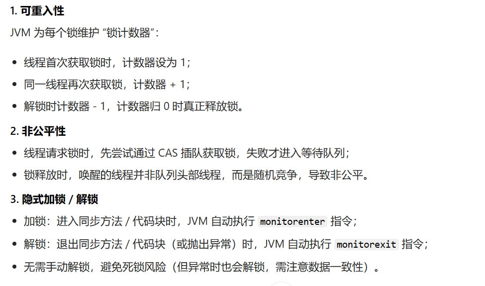 可重入 , 非公平 , 隐式加锁/解锁(JVM 自动处理)
