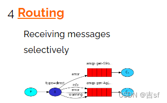路由模式 Routing:需要设置类型为 direct 的交换机,交换机和队列进行绑定,并且指定 routing key,当发送消息到交换机后,交换机会根据 routing key 将消息发送到对应的队列。