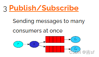 发布订阅模式 Publish/subscribe:需要设置类型为 fanout 的交换机,并且交换机和队列进行绑定,当发送消息到交换机后,交换机会将消息发送到绑定的队列。