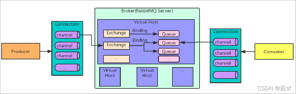 Virtual host:出于多租户和安全因素设计的,把 AMQP 的基本组件划分到一个虚拟的分组中,类似于网络中的 namespace 概念。当多个不同的用户使用同一个 RabbitMQ server 提供的服务时,可以划分出多个vhost,每个用户在自己的 vhost 创建 exchange/queue 等