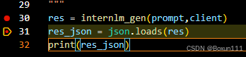 4. 左上角显示了每一步的变量变化情况(包含res变量),点击continue功能发现31步开始报错,原因如图,造成本bug的原因与LLM的输出有关
