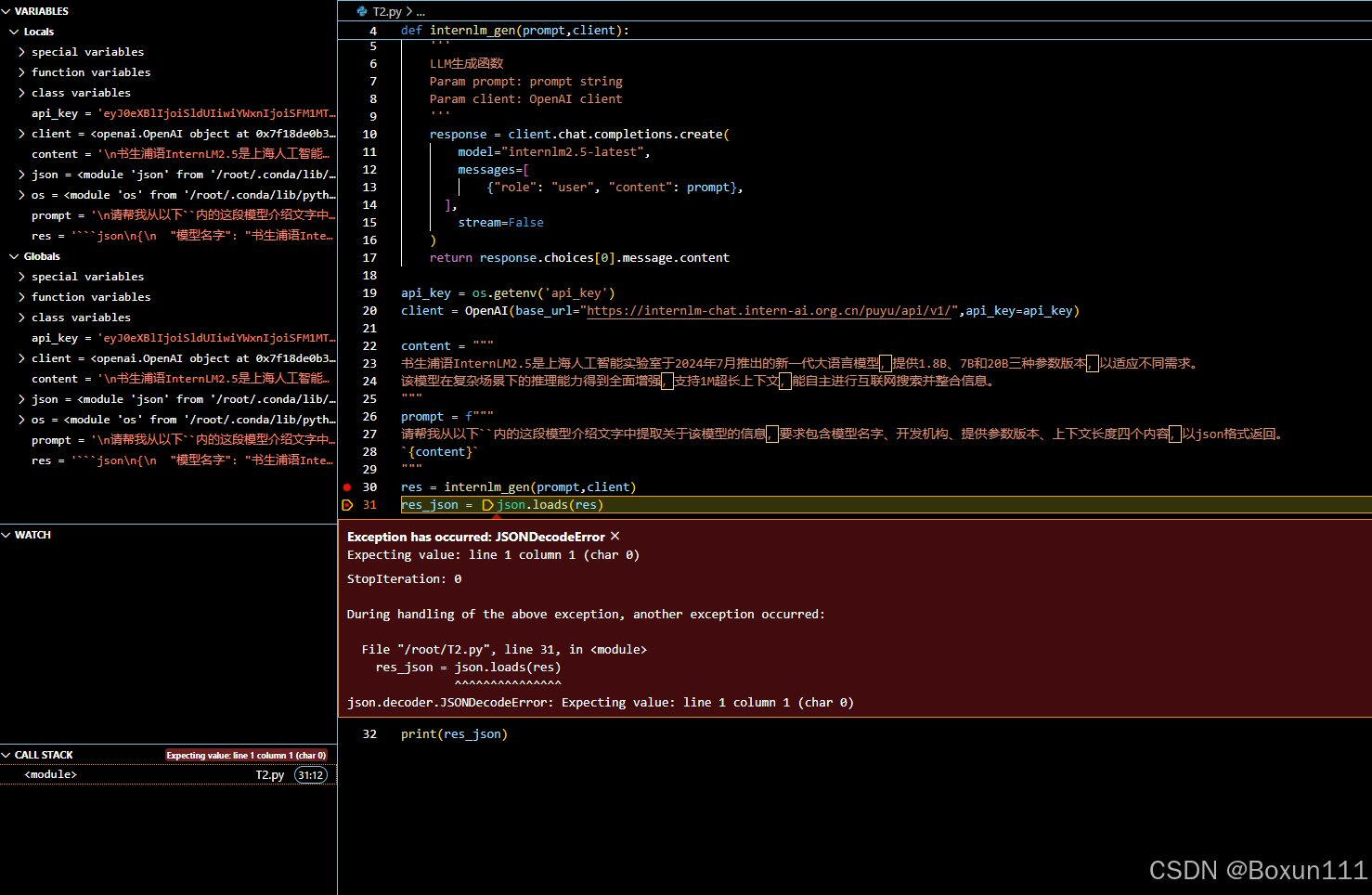 Task2: 通过debug功能定位到调用书生浦语API实现将非结构化文本转化成结构化json的例子的报错原因;