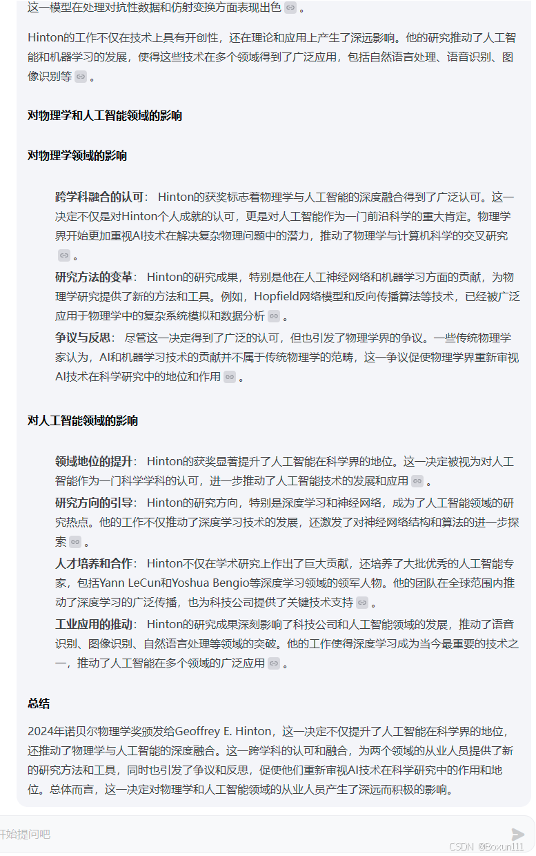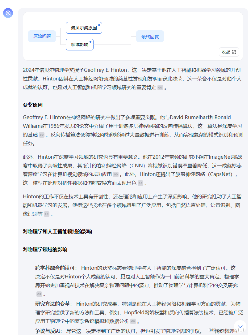 Task 1:MindSearch的使用体验,提出问题:2024 年诺贝尔物理学奖为何会颁发给人工智能领域的科学家 Geoffrey E. Hinton,这一举动对这两个领域的从业人员会有什么影响?回答可见,其形成了思考链,具有逻辑性,回复专业;