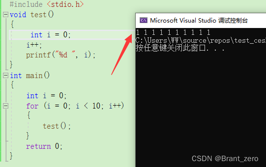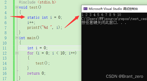 除了以上可见的作用,可以体现static的另一部分隐含的作用是延长声明周期,使static修饰局部变量i改变了变量的生命周期让静态局部变量出了作用域依然存在,到程序结束,生命周期才结束。