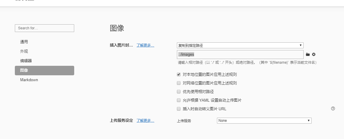 我们通过Typora的文件 ==> 偏好设置==>图像,设置插入图片时,复制到制定路径,然后将路径定位到咱们clone到本地的床图仓库images文件夹内。此时我们本地编写markdown时,已经可以通过粘贴的方式自动将图片拷贝至床图仓库地址了。Typora生成的图片路径为: