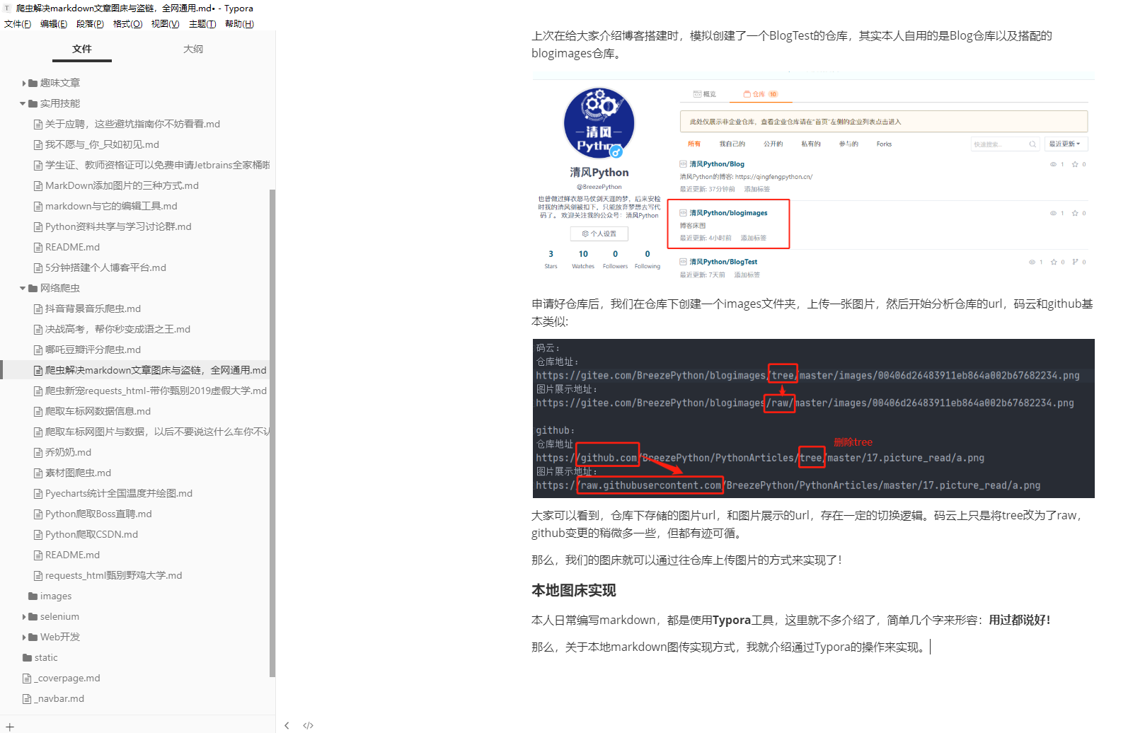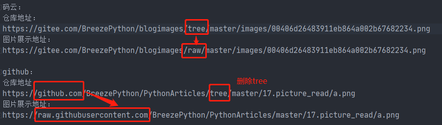 大家可以看到,仓库下存储的图片url,和图片展示的url,存在一定的切换逻辑。码云上只是将tree改为了raw,github变更的稍微多一些,但都有迹可循。
