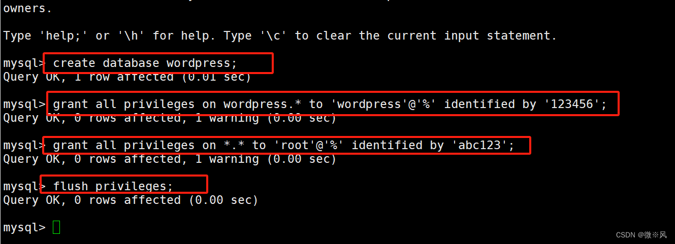 grant all privileges on wordpress.* to 'wordpress'@'%' identified by '123456';