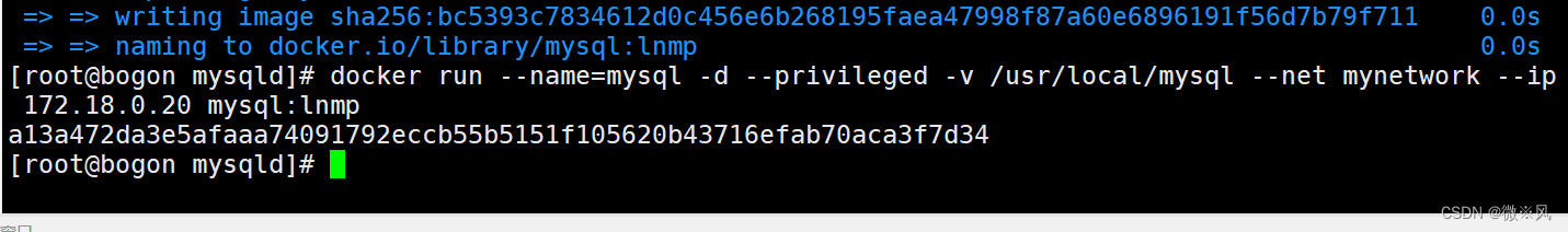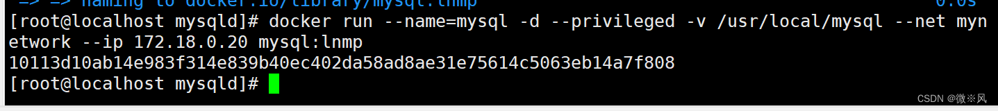docker run --name=mysql -d --privileged -v /usr/local/mysql --net mynetwork --ip 172.18.0.20 mysql:lnmp