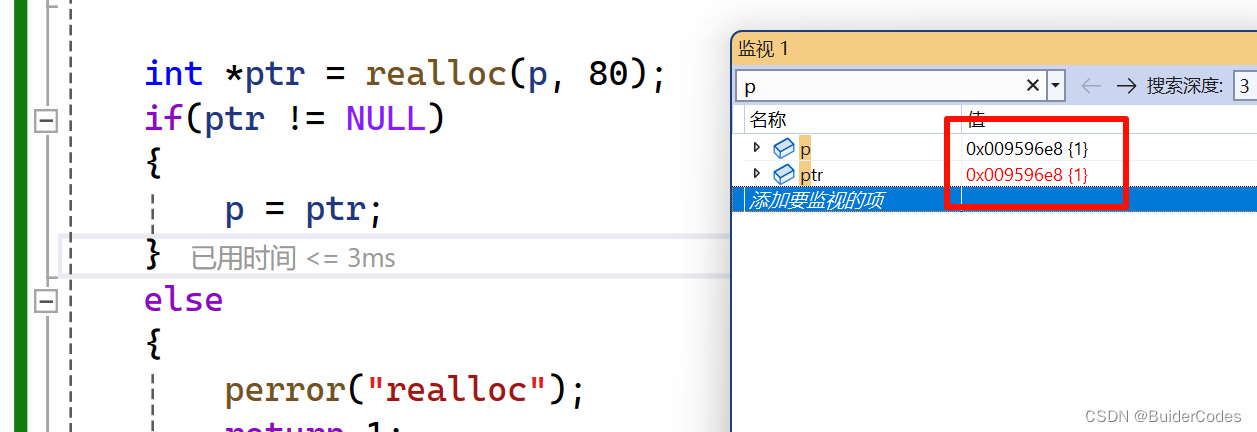 当用realloc扩大较少(相对)空间时, realloc返回的指针就是p ,即p == ptr。