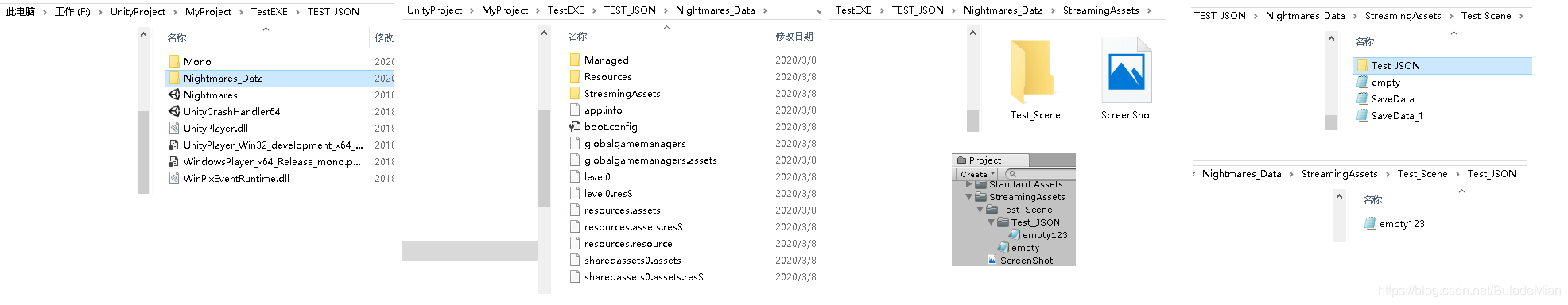 和打包成EXE的文件夹的文件相互对应。文件夹最末端的两个.json文件SaveData.json和SaveData_1.json文件是工程运行EXE后,新建的 文件。不在Unity编辑器中存在。