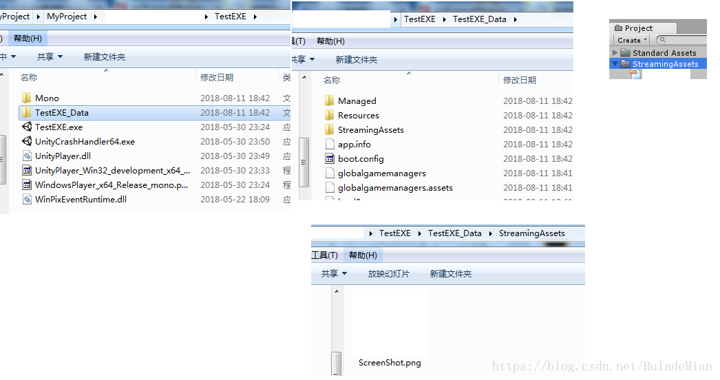 在编译器中新建StreamingAssets 文件夹,里面保存一些 .png .xml .json文件。都是可以在EXE保留这些文件的。