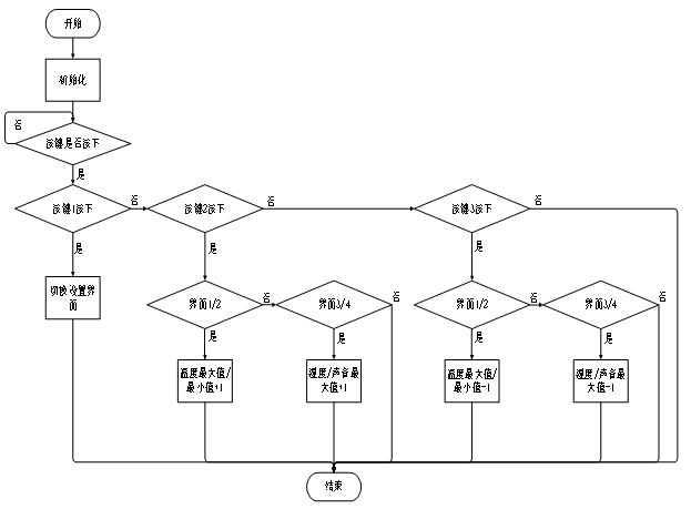 按键函数子流程图如图4-3所示;通过按键扫描,获取按键值,执行相应的处理,检测到按键1按下时,切换设置界面;检测到按键2按下时,界面1:温度最大值+1,界面2:温度最小值+1,界面3:湿度最大值+1,界面4:声音最大值+1;检测到按键3按下时,界面1:温度最大值-1,界面2:温度最小值-1,界面3:湿度最大值-1,界面4:声音最大值-1。
