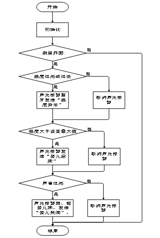 处理状态子函数流程图如图4-5所示,然后进入第四个函数处理函数,温度过高或过低,进行声光报警,并通过蓝牙发送“温度异常”提示信息,湿度大于设置最大值,声光报警,发送“婴儿尿床”提示信息,声音过高,声光报警器,启动步进电机来回摇晃婴儿床,并通过蓝牙发送“婴儿哭闹”提示信息。