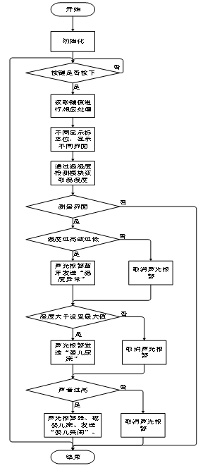 系统的主流程图如图4-2所示;在主程序中,首先对各个模块进行初始化,随后进入while主循环,在主循环中,首先进入第一个函数按键函数,通过按键扫描检测按键是否按下,通过按键进行界面的切换,设置温度值、声音最值;然后进入第二个函数监测函数,通过温度检测模块检测婴儿床温度;然后进入第三个函数显示,根据不同的显示模式标志位,显示不同的界面;界面0:测量界面,显示温度,湿度,声音大小。界面1,显示设置温度最大值。界面2,显示设置温度最小值。界面3,显示设置湿度最大值。界面4:显示设置声音最大值;然后进入第四个函数处理函数,温度过高或过低,进行声光报警,并通过蓝牙发送“温度异常”提示信息,湿度大于设置最大值,声光报警,发送“婴儿尿床”提示信息,声音过高,声光报警器,启动步进电机来回摇晃婴儿床,并通过蓝牙发送“婴儿哭闹”提示信息。
