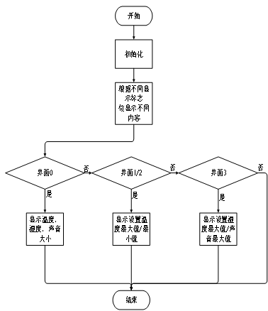 显示函数子流程如图4-4所示;通过不同的显示模式标志位,测量模式:界面0:测量界面,显示温度,湿度,声音大小。界面1,显示设置温度最大值。界面2,显示设置温度最小值。界面3,显示设置湿度最大值。界面4:显示设置声音最大值。