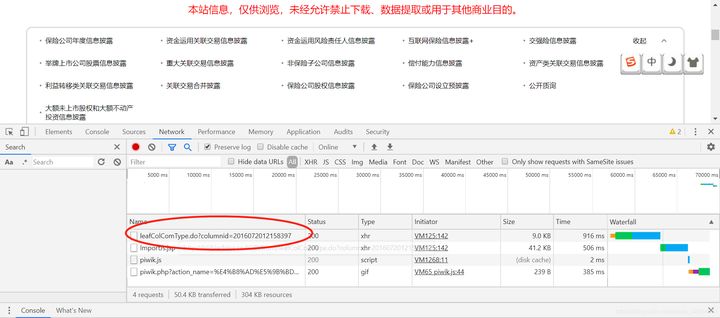 此时,我们需要找到发送真实请求的页面。我们打开开发者工具,在Network中勾选ALL,清空后重新点击我们要选取的科目,如关联交易合并披露。神奇的事情出现了,红框中标示出来了一个新的url,那么这个url是不是我们真正要找的OnePiece呢?