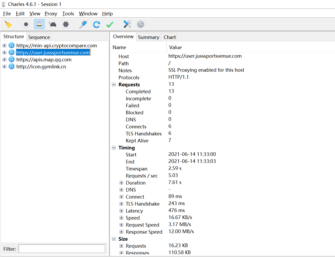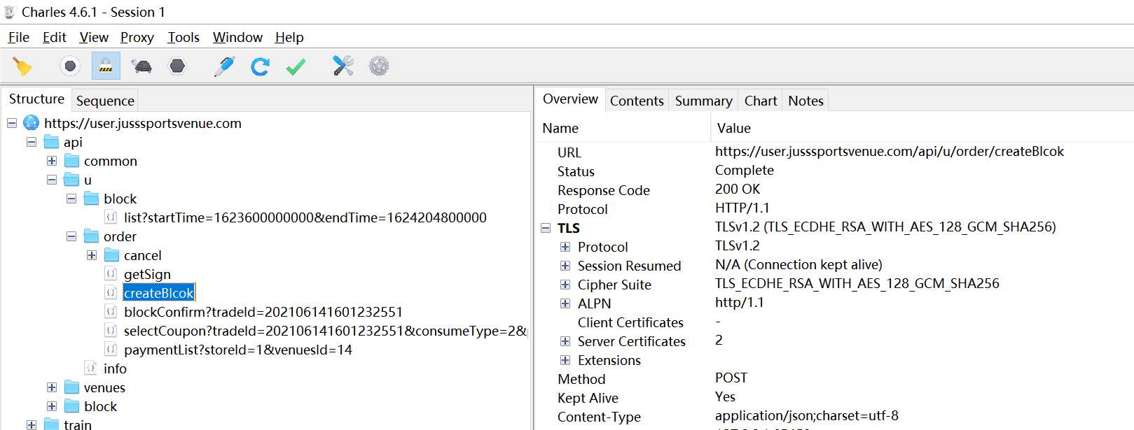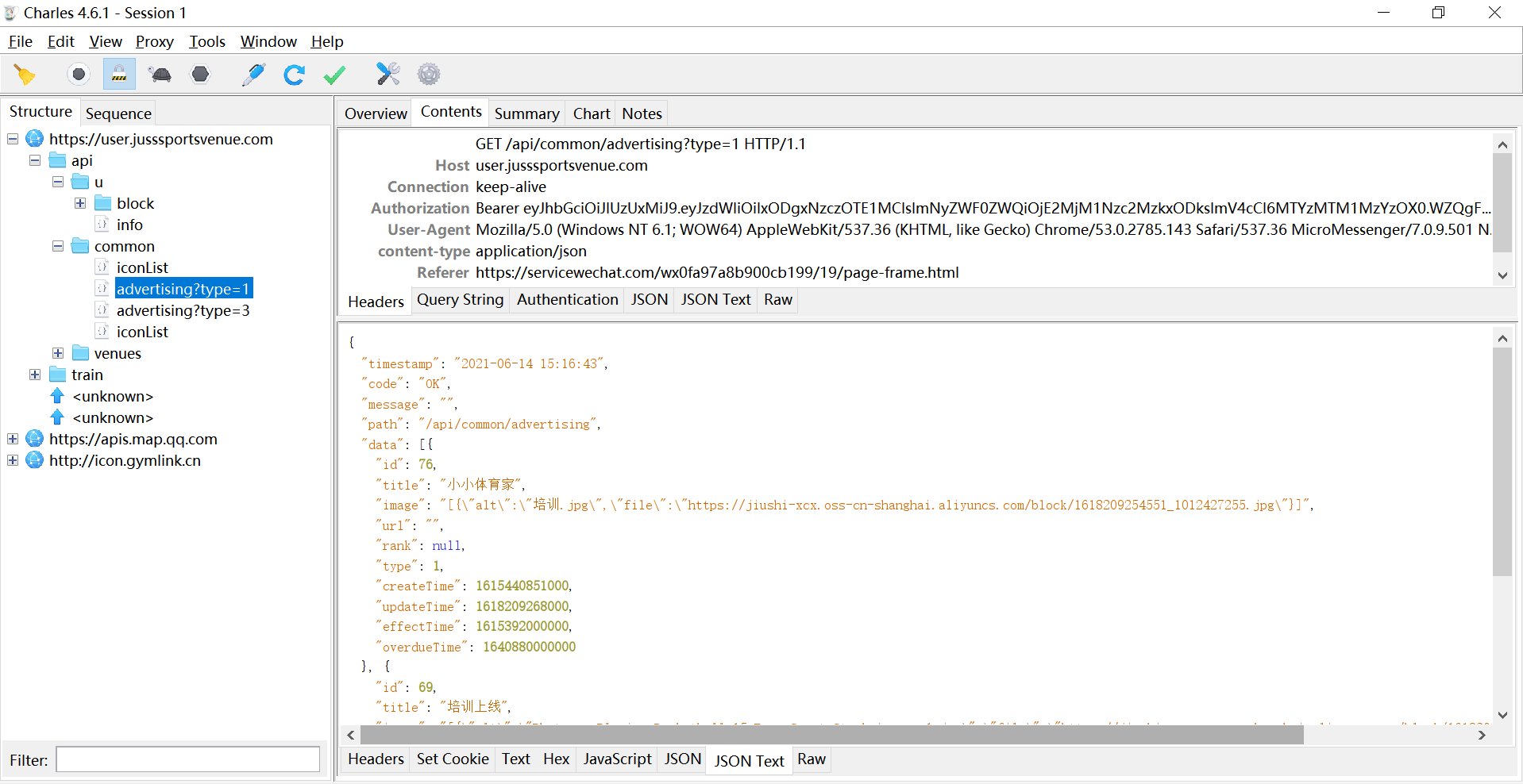 我们点开目标小程序:久事体育场馆(https://user.jusssportsvenue.com) 的文件夹,探索一下Charles为我们抓取了什么。