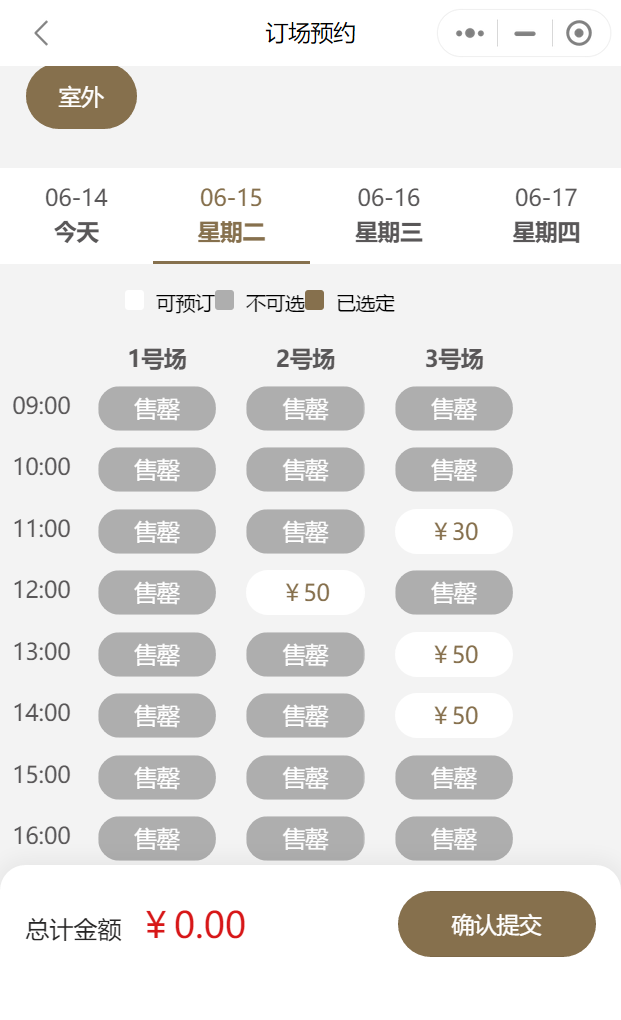 我们先关闭打开的微信小程序并点击Charles的扫帚状按钮,清除当前session的数据。我们重新打开微信小程序,点击网球,选择我们的目标场地:东方体育中心。我们选择想订的时间,例如,周二13点的三号场,点击确认提交。